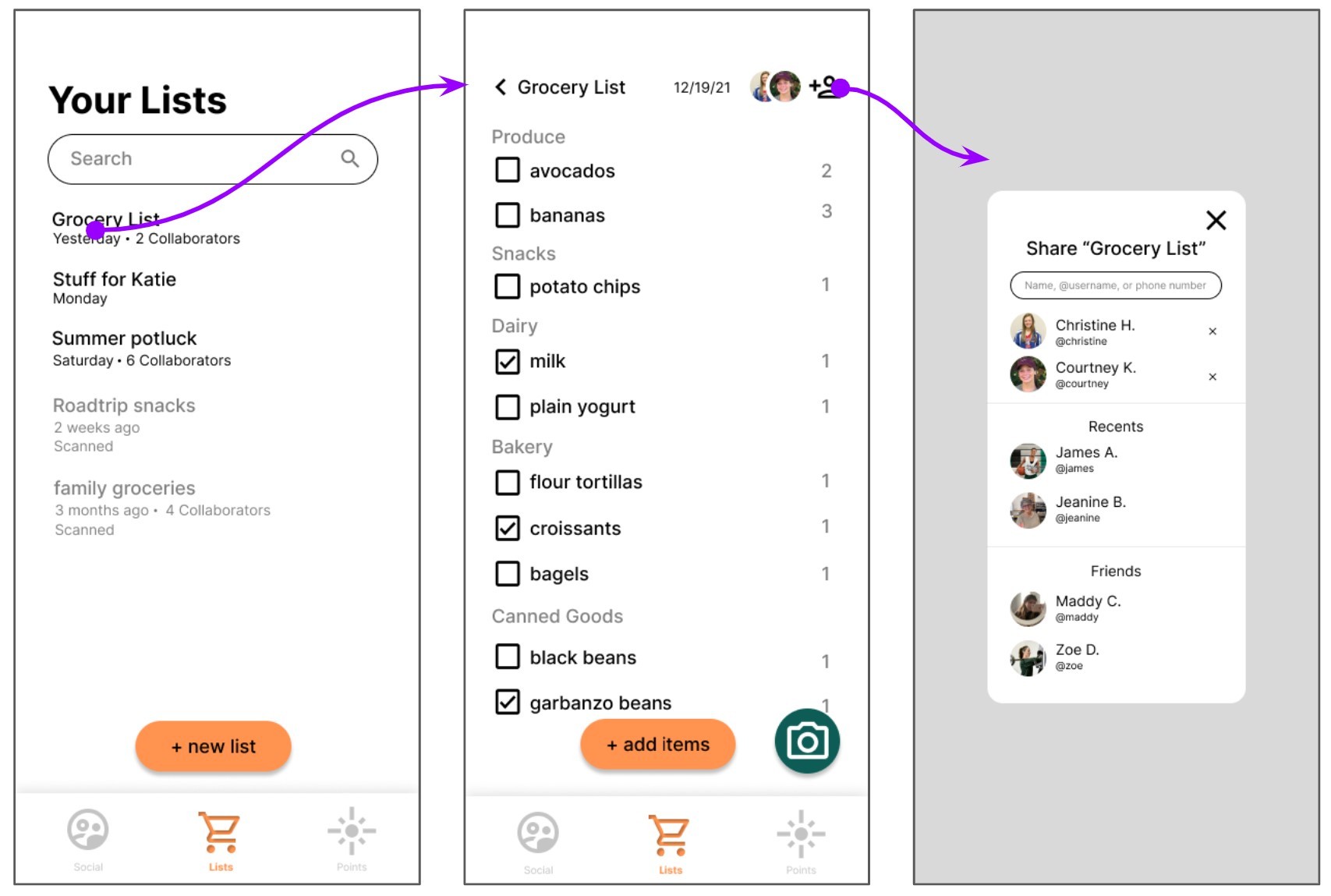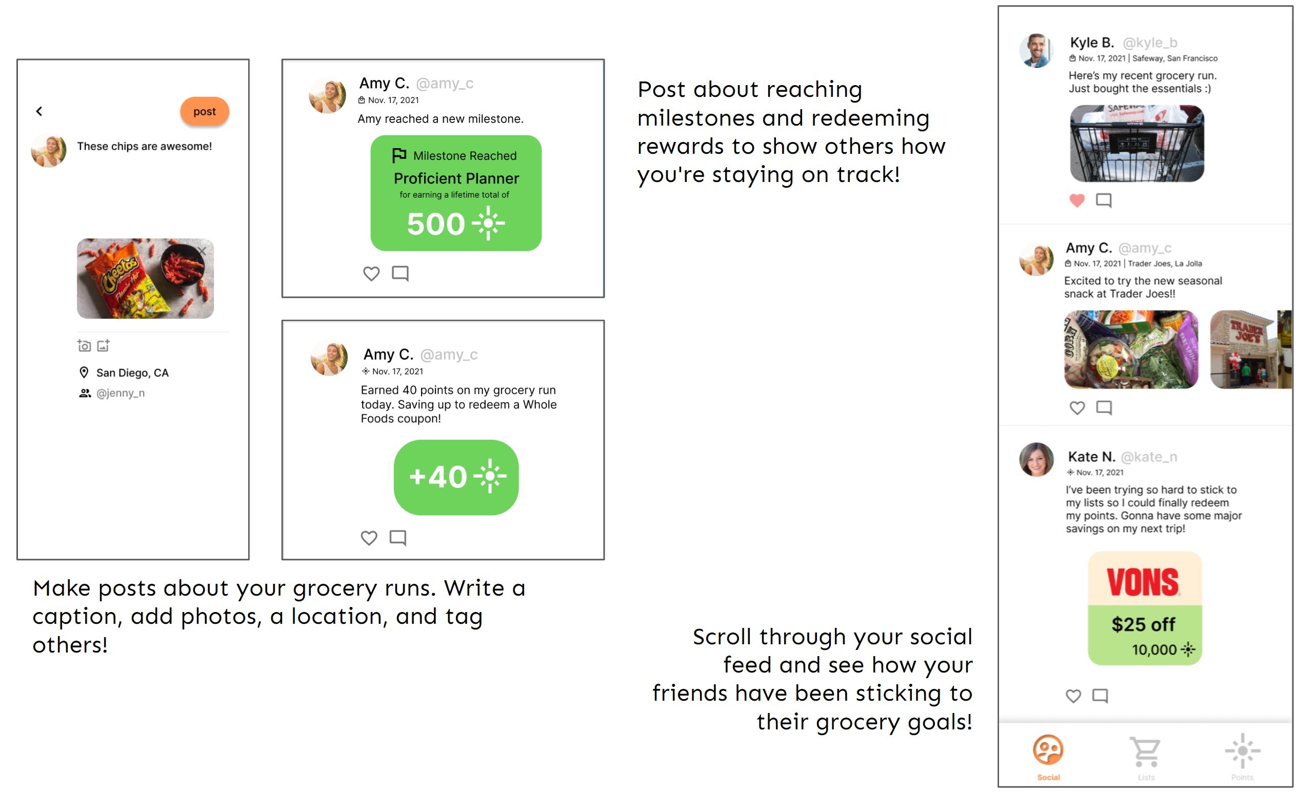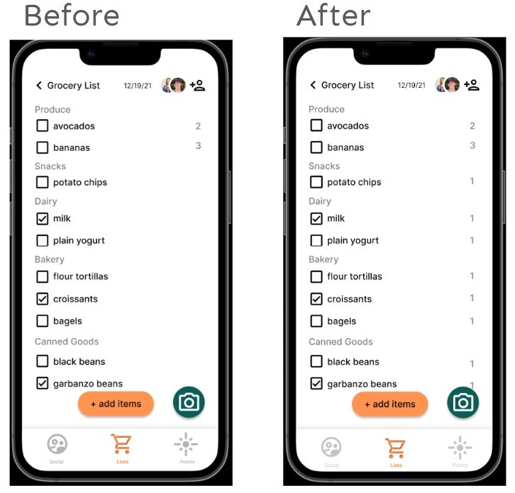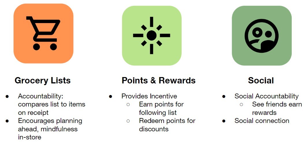 Simple, intuitive lists that compare planned vs. purchased items. Incentivizing sticking to the plan with points.