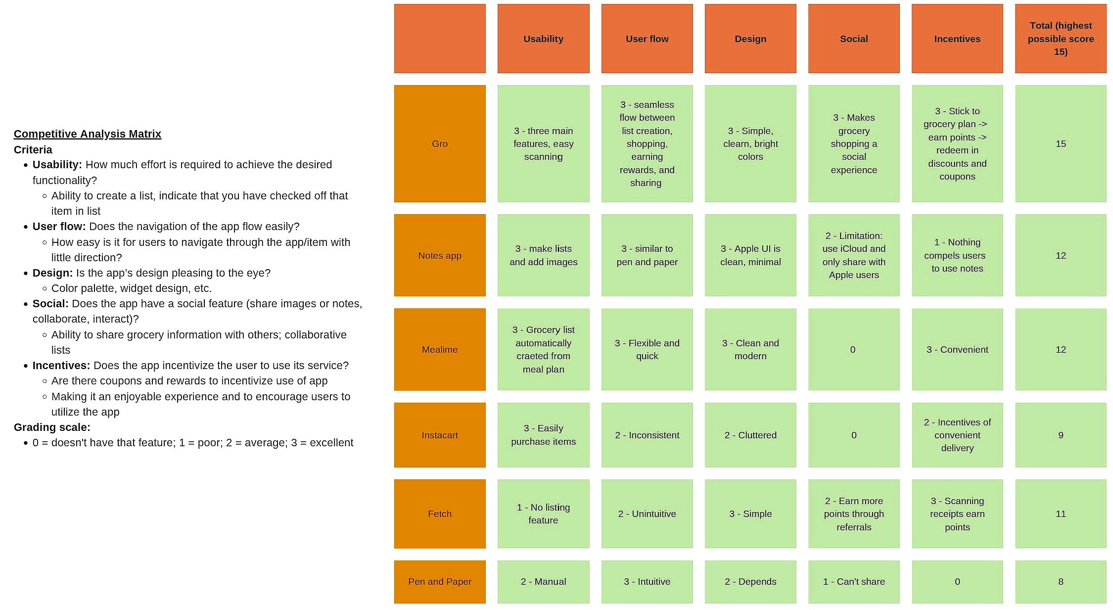We compared Gro against iOS Notes, Mealime, Instacart, Fetch, and pen-and-paper lists. Our evaluation criteria included usability, user flow, design, social features, and incentives. We identified two clear gaps: